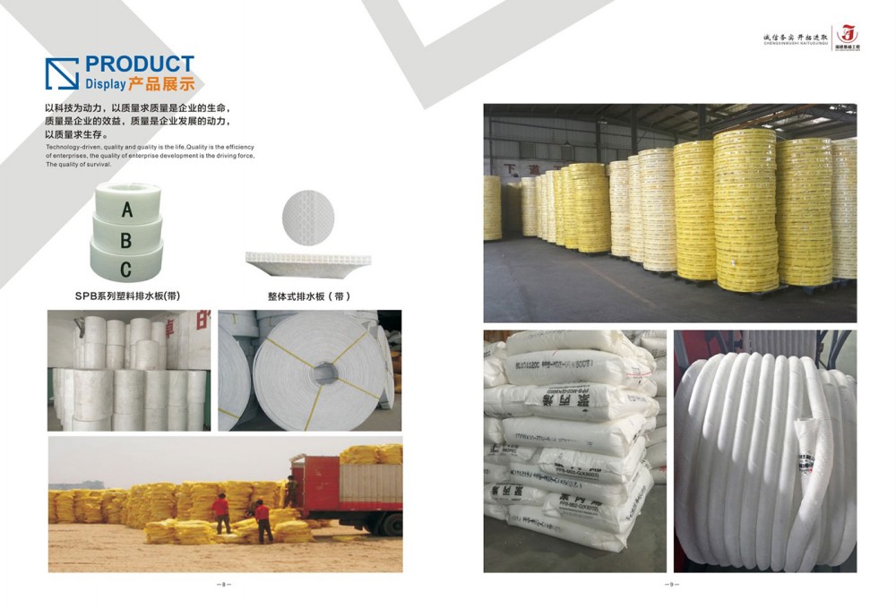 本公司專業(yè)生產(chǎn)“瑞建”牌塑料排水板系列產(chǎn)品,產(chǎn)品規(guī)格、型號(hào)齊全,能滿足各種軟土地基的加固處理等。產(chǎn)品質(zhì)量經(jīng)國(guó) 家權(quán)威機(jī)構(gòu)檢測(cè),各項(xiàng)指標(biāo)均超過(guò)國(guó)家標(biāo)準(zhǔn)和工程設(shè)計(jì)技術(shù)要求。質(zhì)量穩(wěn)定性和技術(shù)創(chuàng)新居國(guó)內(nèi)同行業(yè)首位;并通過(guò)省級(jí)技術(shù)成 果鑒定。產(chǎn)品銷往國(guó)內(nèi)各省市及國(guó)外,深受用戶的歡迎和好評(píng)。在多項(xiàng)重點(diǎn)工程中被建設(shè)單位(業(yè)主)評(píng)為指定產(chǎn)品。